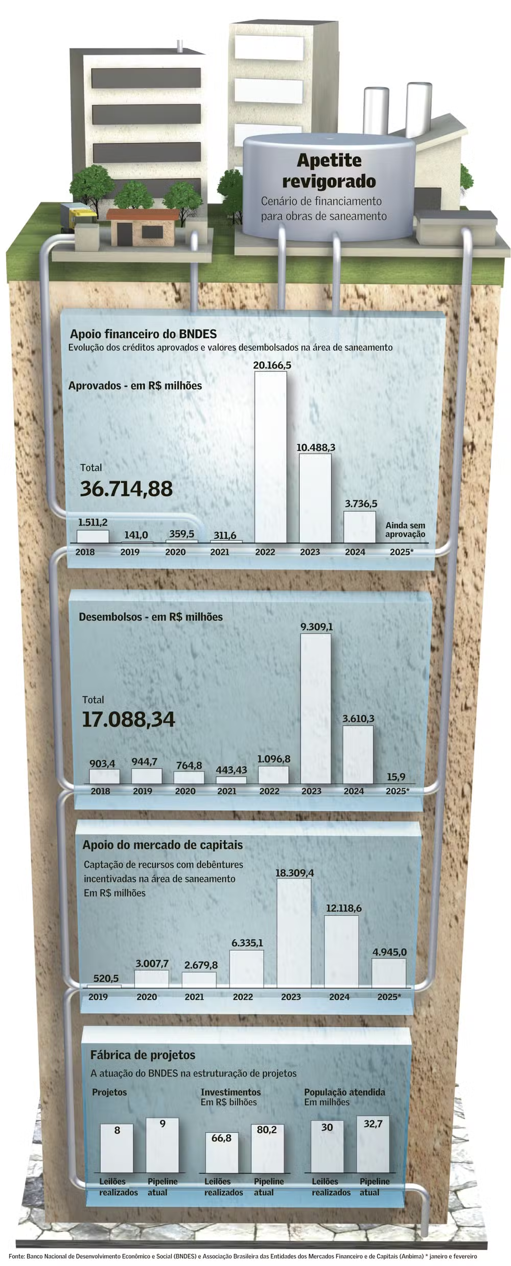 A Associação e Sindicato Nacional das Concessionárias Privadas deServiços Públicos de Água e Esgoto (Abcon Sindcon) estima em 26 os ativos de saneamento com potencial de ir a leilão em 2025. Isso proporcionará investimentos de R$ 70 bilhões no setor. A maioria dos projetos é de pequeno e médio portes. Entre os ativos de grande porte está a concessão de água e esgoto do Pará. Apenas esse certame, agendado para 11 de abril, deve impulsionar aportes de R$ 18,5 bilhões.