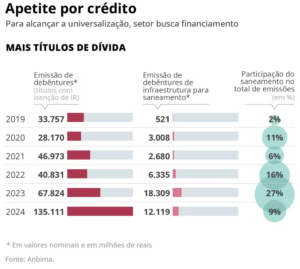 Os valores foram menores do que em 2023. Isso mesmo com o recorde nas emissões totais de debêntures de infraestrutura, com R$ 135 bilhões, o dobro do ano anterior. Segundo especialistas, a flutuação está relacionada ao cronograma de leilões de saneamento: após projetos “gigantes”, como as quatro áreas antes operadas pela Cedae no Rio, entraram concessões menores. Daqui para a frente, não faltarão recursos, dizem fontes do mercado e o BNDES.