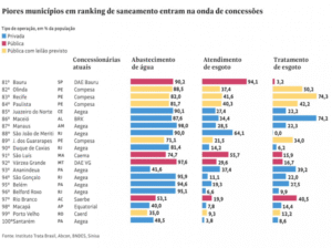 Dos 20 municípios que figuram no fim do ranking nacional elaborado pelo Instituto Trata Brasil, 16 já passaram ou devem passar por concessões até o próximo ano. É o caso de Santarém (PA), último da lista com 4% de coleta de esgoto, e cujo contrato foi recentemente arrematado pela Aegea.