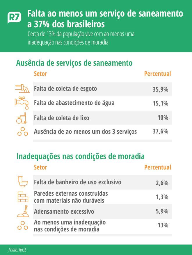 De acordo com o levantamento, o maior problema é a falta da coleta de esgoto, que aflige 35,9% da população. Outros 15,1% vivem em ambientes sem abastecimento de água por rede geral de distribuição e 10% não contam com a coleta direta ou indireta de lixo.