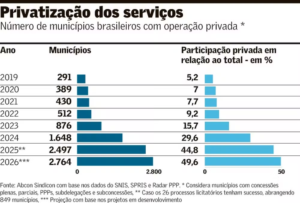 Investimentos estimados em cerca de R$ 70 bilhões neste ano devem ampliar a presença de operadores privados no serviço de saneamento básico à metade dos municípios do país já em 2026. Ainda longe de atingir a universalização prevista para dezembro de 2033, que exigirá a necessidade de pelo menos R$ 900 bilhões em recursos, a Abcon Sindicon (Associação e Sindicato Nacional das Concessionárias Privadas de Serviços Públicos de Água e Esgoto) projeta a presença privada em 2.764 municípios no próximo ano com base nos projetos em desenvolvimento que dispõem de cronograma ou passaram por consulta pública.